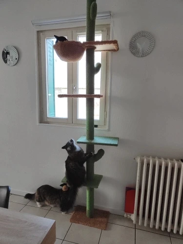 mes chats l'ont vite adoptée. juste la barre qui est tout en haut que je vais changer par de l'acier , avec le poids des chats il balance. mais sinon très bon article.